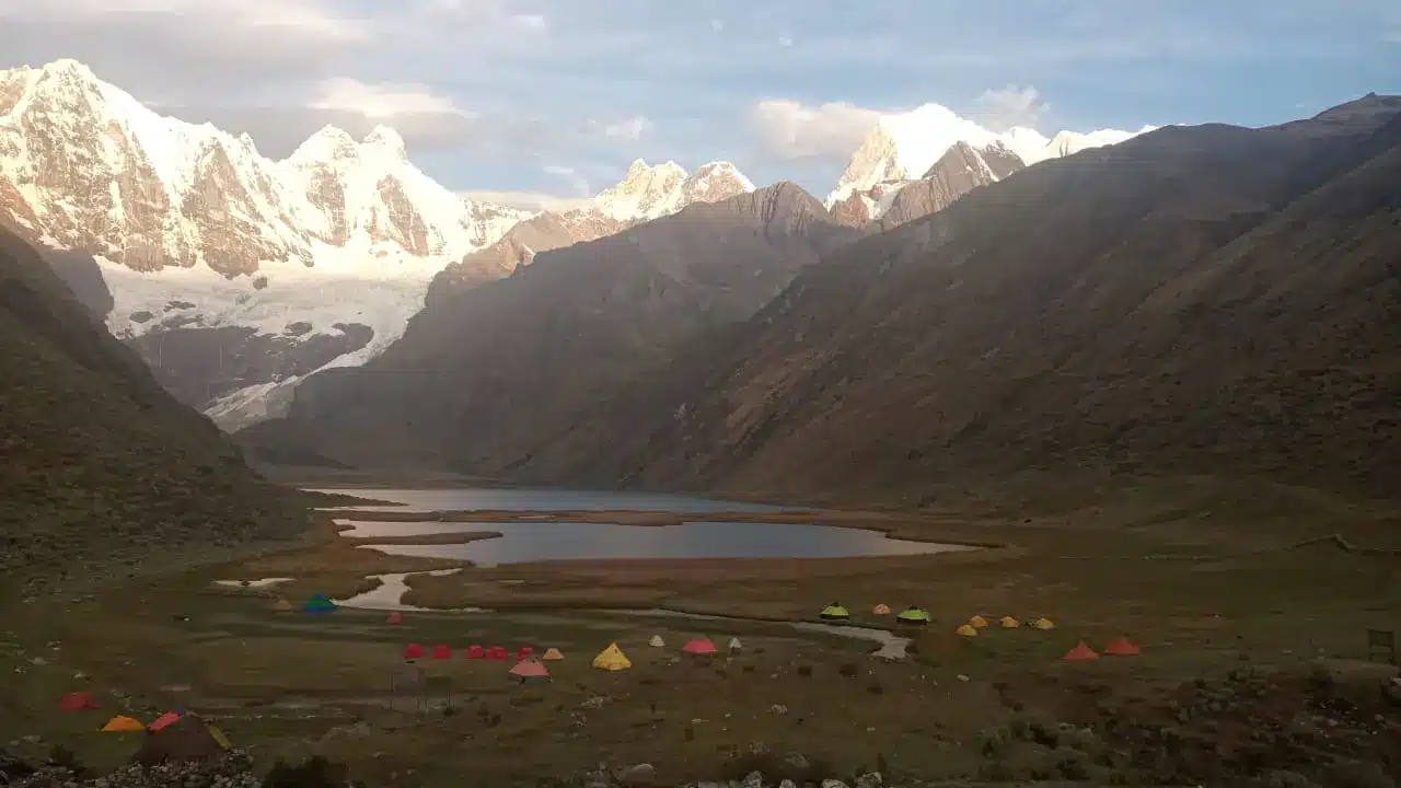En el camino hacia el campamento, se tiene impresionantes vistas panorámicas de la laguna Jahuacocha, Solterococha y el nevado Jirishanca.